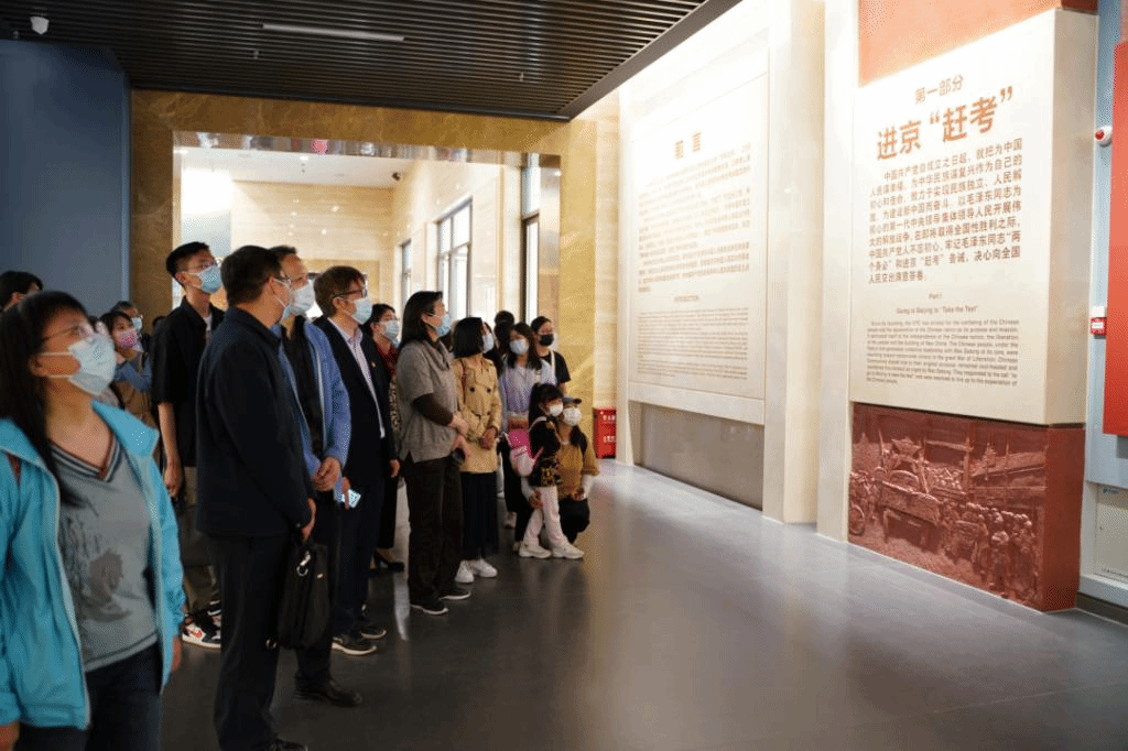 在进京“赶考”展区,老师与同学们不时驻足观看。中共七届二中全会确定12本干部必读书目展柜吸引了大家的目光,党总支书记祝和军老师谈到:“毛泽东同志在七届二中全会的总结中曾经指出,规定在三年内把这十二本书读一到两遍,对宣传马克思主义,提高我们的马克思主义水平,应当有共同的认识。这对我们今天深化马克思主义理论教学,推进党史学习教育也有着重要的启示意义。我们既要树立经典意识、原著意识,更要真正做到读完读通,入心入脑,即学即行;在渡江战役中使用的木船前,同学们迟迟不愿离去。2020级党员陈曦同学说到:“正是在香山,中共中央指挥了举世闻名的渡江战役,吹响了“打过长江去,解放全中国”的伟大进军号角。今天看到展示的木船,仿佛能跨越历史感受到“钟山风雨起苍黄,百万雄师过大江”的豪迈气势;在“不忘初心、牢记使命”展区,参与活动的2020级入党积极分子冯子妍同学不时拍照留存,她说:“今天的参观让我了解到了在党的领导下,中华民族是如何站起来的。中国特色社会主义进入新时代,我们又实现了由富起来到强起来的伟大飞跃。我们要倍加珍惜这来之不易的革命建设成果,不忘初心、牢记使命”;参观最后,pp电子游戏平台网站党总支全体党员在纪念馆宣誓厅进行了“重温入党誓词”活动。面对着鲜红的党旗,学生党支部书记冯高洋领誓,马院全体党员紧握拳头、举起右手,重温了入党誓词。
