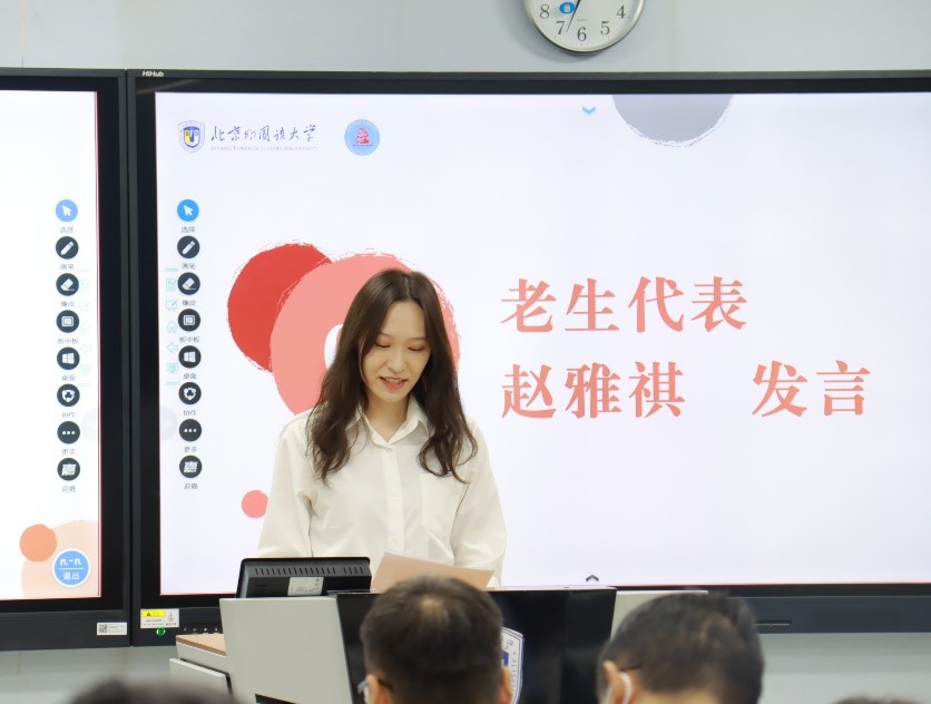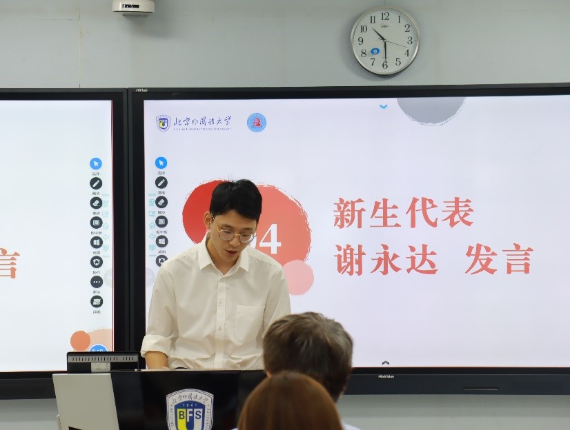 2022级谢永达、2021级赵雅祺分别作为新生、老生代表发言。谢永达分享了自己关于“青年马院”与“马院青年”的理解,希望未来三年通过在北外马院的所学所得,“以青春之我,创建青春之社会”, 将个人命运同国家命运紧紧联系在一起。赵雅祺围绕“在马信马”、“在马言马”的主题,号召同学们要成为有家国情怀、有全球视野、有专业本领的复合型人才,同时鼓舞大家求索真理、砥砺信仰、锻炼本领。