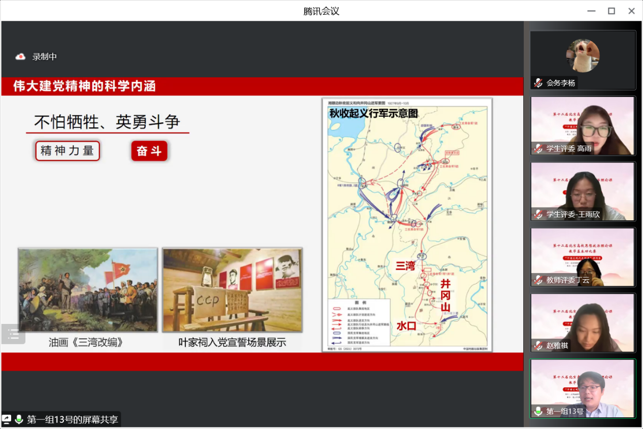 本次教学比赛分为教案设计和教学展示两个环节,每位参赛选手将党的二十大精神融入参赛专题提交一份45分钟教案和20分钟展示课件。比赛分两组同时进行,每组评委由3位专家评委和5名学生评委组成。本次比赛选手选题丰富、视野宏大,主要集中于探讨中国共产党对中国式现代化的艰辛探索、中国共产党对跳出历史周期率的探索历程,以及伟大建党精神的科学内涵等。20分钟的教学展示环节,选手们清晰的逻辑、精炼的语言、生动的互动充分体现了新时代青年思政课教师的风采。