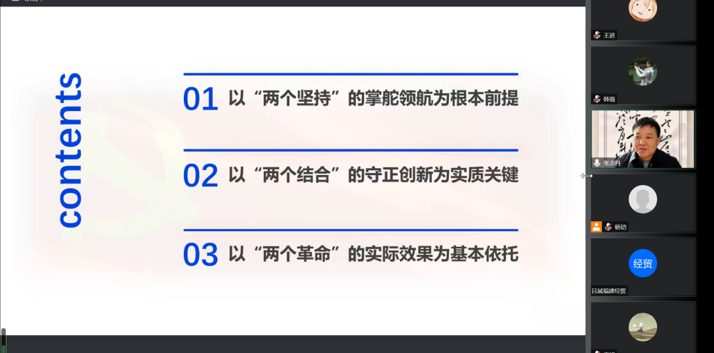 会议伊始,张志丹指出,无论是百年党史,还是新时代十年党史,都是一部不断推进马克思主义“化中国”的实践史,也是一部不断推进理论创新、进行理论创造的思想史。他用“焕然一新、破旧立新、返本开新、守正创新”回顾中国共产党百年思想发展史的四个阶段,并对新时代十年意识形态创新的新飞跃作出精辟解读。