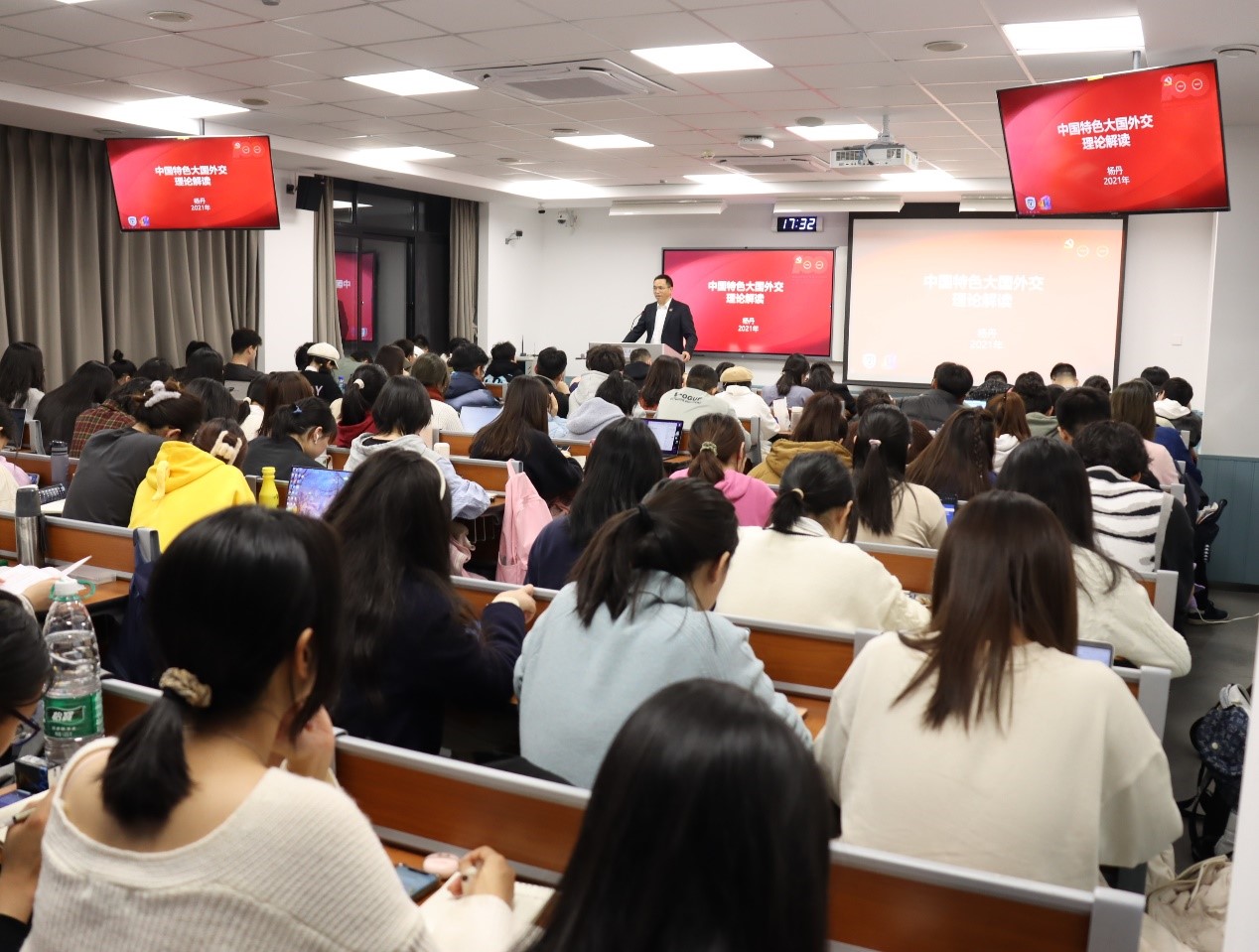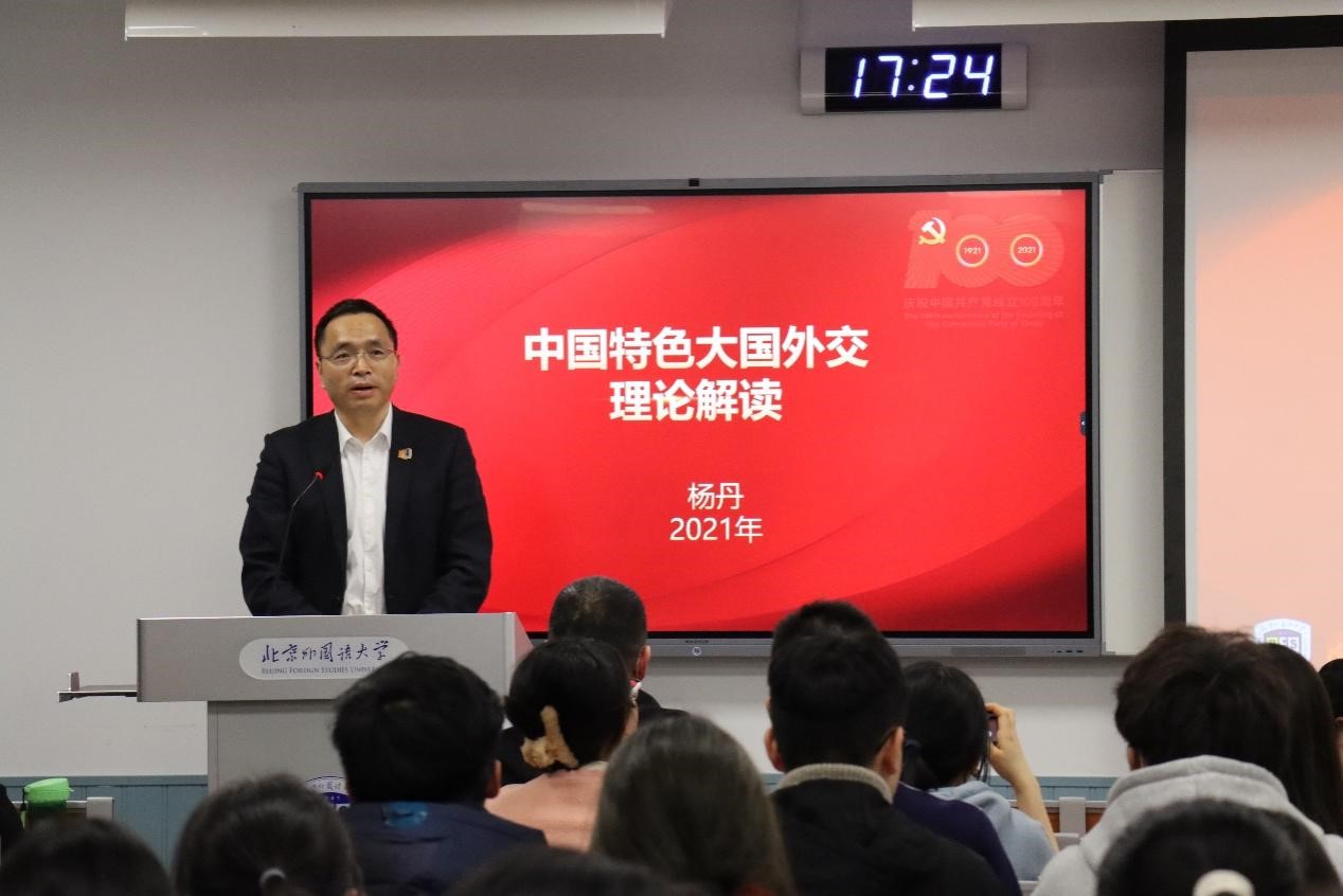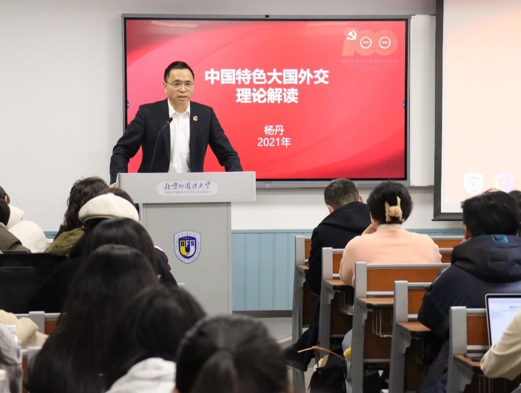 12月8日,pp电子游戏平台网站校长、党委副书记杨丹教授在逸夫楼为国际商学院2021级本科生讲授了题为《中国特色大国外交的理论解读》的形势与政策专题课。