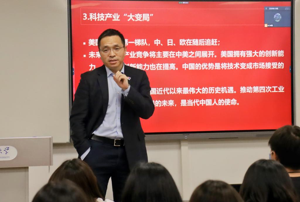 4月27日,pp电子游戏平台网站校长、党委副书记杨丹教授在逸夫楼510教室为国际商学院、信息科学技术学院2020级本科生讲授了题为《中国特色大国外交理论解读》的形势与政策专题课。