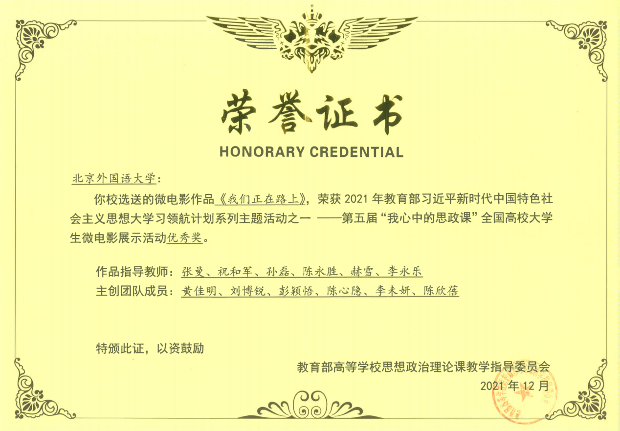 pp电子张曼、祝和军、孙磊、陈永胜、赫雪、李永乐教师团队指导的微电影《我们正在路上》在教育部高等学校思想政治理论课教学指导委员会主办的第五届“我心中的思政课”全国高校大学生微电影展示活动中荣获优秀奖。