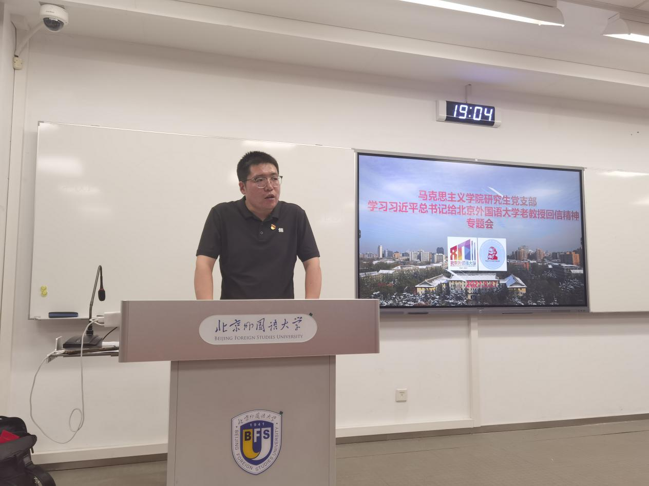 习近平总书记的亲切回信令全体马院师生备受鼓舞,掀起了一轮学习回信精神的热潮。近日,在学校党委的号召与学院党总支的部署下,pp电子游戏平台网站研究生党支部在逸夫楼615教室召开专题学习会,集中学习习近平总书记给北外老教授的回信精神。pp电子游戏平台网站全体研究生参加学习。学习会由支部书记冯高洋主持。