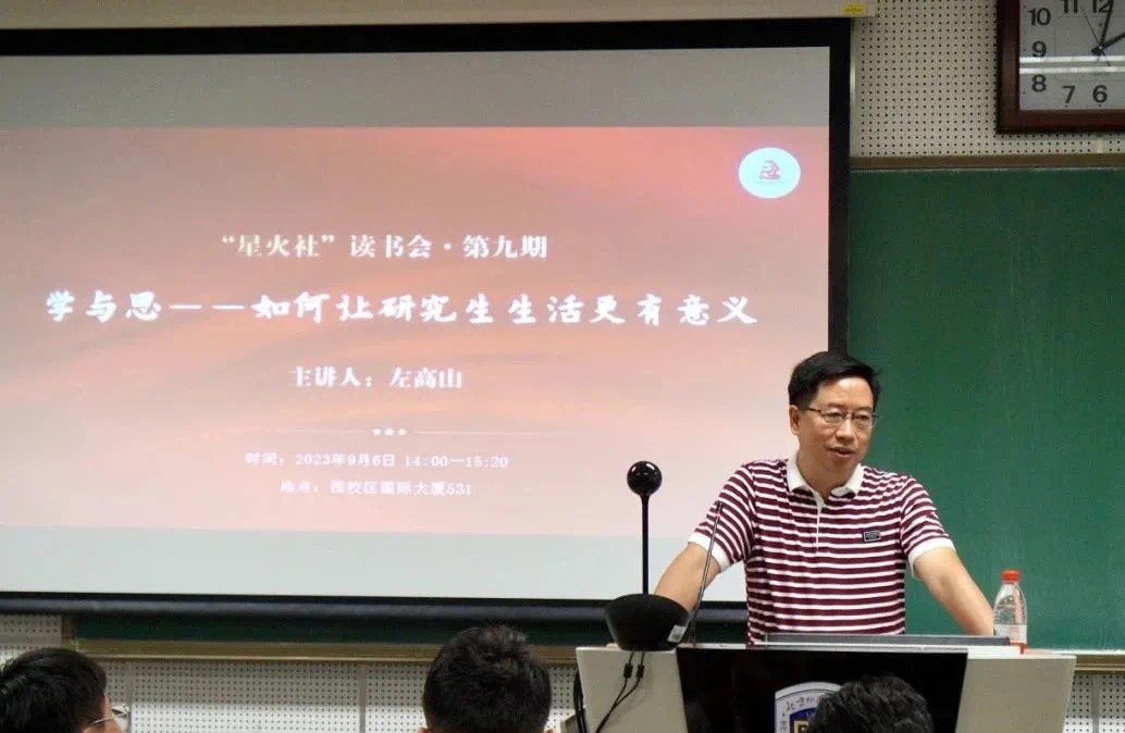问渠那得清如许,为有源头活水来。9月6日下午,pp电子游戏平台网站第九期“星火社”读书会在国际大厦531教室举行,2023级全体研究生参加了读书会。pp电子游戏平台网站博士生导师左高山教授为同学们带来《学与思·如何让研究生生活更有意义》的专题讲座。左高山以“苏格拉底之问:人究竟怎样活着才有意义”为切入点,带领大家探讨研究生阶段的特点和意义,并就如何正确处理师生关系、同学关系和论文写作等问题对同学们进行了深入指导,鼓励大家要善于阅读、勤于思考、勇于实践,度过难忘而有意义的研究生生涯。