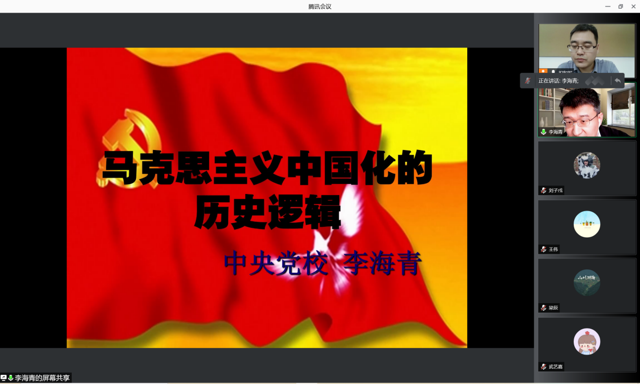 10月28日下午,北外马院马克思主义讲堂第五期活动在线上进行。中共中央党校pp电子游戏平台网站马克思主义中国化研究所所长、博士生导师、中央党校创新工程首席专家李海青教授以“马克思主义中国化的历史逻辑”为题做了精彩讲座。本次讲座由pp电子游戏平台网站党总支书记祝和军主持。