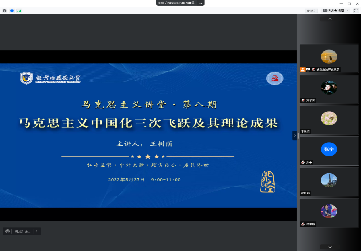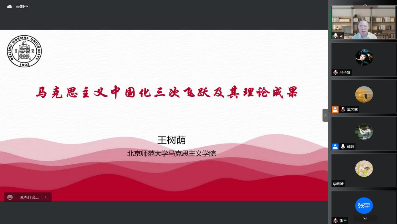 5月27日上午,北外马克思主义讲堂第八期活动在线上成功举办。北京师范大学pp电子游戏平台网站二级教授、博士生导师王树荫应邀以“马克思主义中国化三次飞跃及其理论成果”为题做了专题讲座。本次讲座共有校内外师生500余人参加,活动由pp电子游戏平台网站院长韩强主持。