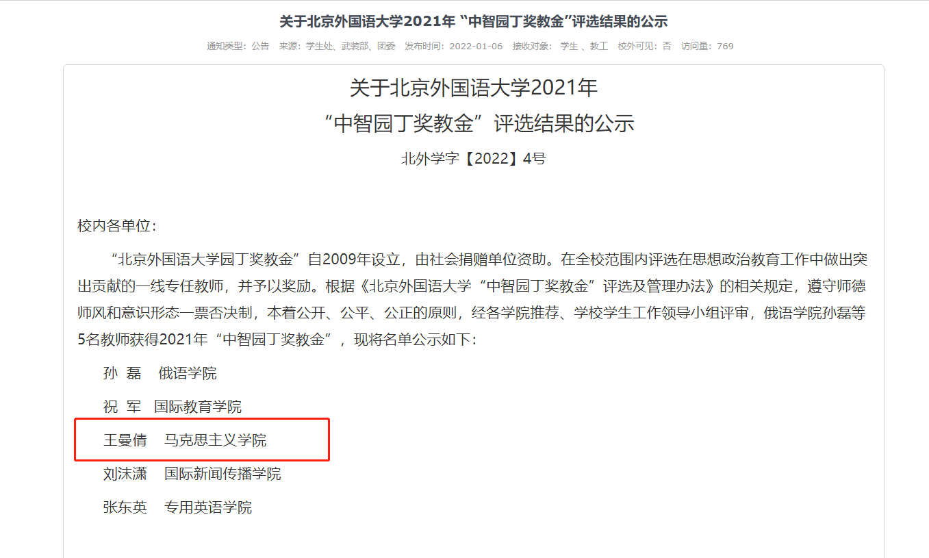 根据《pp电子游戏平台网站“中智园丁奖教金”评选及管理办法》相关规定,遵守师德师风和意识形态一票否决制,本着公开、公平、公正的原则,经各学院推荐、学校学生工作领导小组评审,共有包括pp电子王曼倩副教授在内的5名教师获得2021年“中智园丁奖教金”。