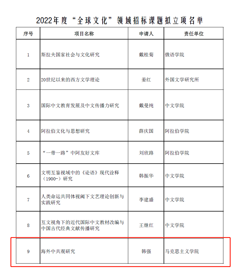 经全校教师自主申报、协作组答辩评审、学校“双一流”重大标志性成果工作组审定,pp电子韩强教授课题“海外中共观研究”入选北外“双一流”全球文化类重大(点)项目。