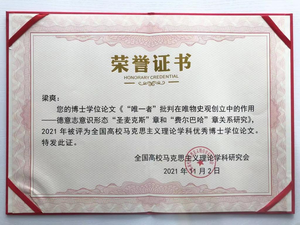 2023年11月4日,由全国高校马克思主义理论学科研究会主办的全国高校马克思主义理论学科博导论坛暨全国高校马克思主义理论学科优秀博士学位论文颁奖典礼在安徽师范大学举行,会议对2021—2023年度全国高校马克思主义理论学科优秀博士学位论文奖获得者进行了表彰。pp电子教师梁爽获此奖项。