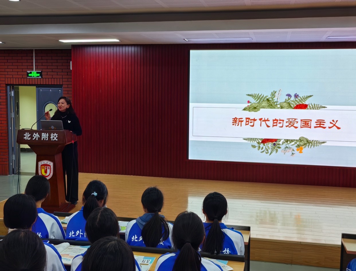 为贯彻落实党的二十大关于 “用社会主义核心价值观铸魂育人,完善思想政治工作体系,推进大中小学思想政治教育一体化建设”的精神,pp电子pp电子游戏平台网站教师刘菁于2023年11月9日下午,赴pp电子游戏平台网站附属外国语学校,与附校高中德育处、思政教学一体化课题组联合举办了一场主体为“新时代爱国主义”的讲座。