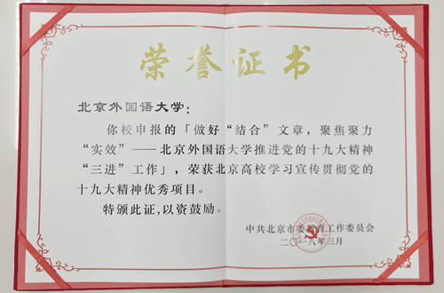 党的十九大以来,pp电子游戏平台网站按照党中央、教育部、北京市委、北京市委教育工委、学校党委的部署要求,深入学习宣传贯彻党的十九大精神,结合pp电子游戏平台网站的多语种实际和pp电子游戏平台网站的专业优长,结合深入看展“思政课教学质量年”各项工作,创新形式,着重做好“结合”的文章,聚焦聚力“实效”,在学懂弄通做实上下功夫,积极推动党的十九大精神进教材、进课堂、进学生头脑、进网络、进学科建设、进科学研究、进教师头脑、进普及活动,使党的十九大精神在学院师生和学院建设中真正落地生根。