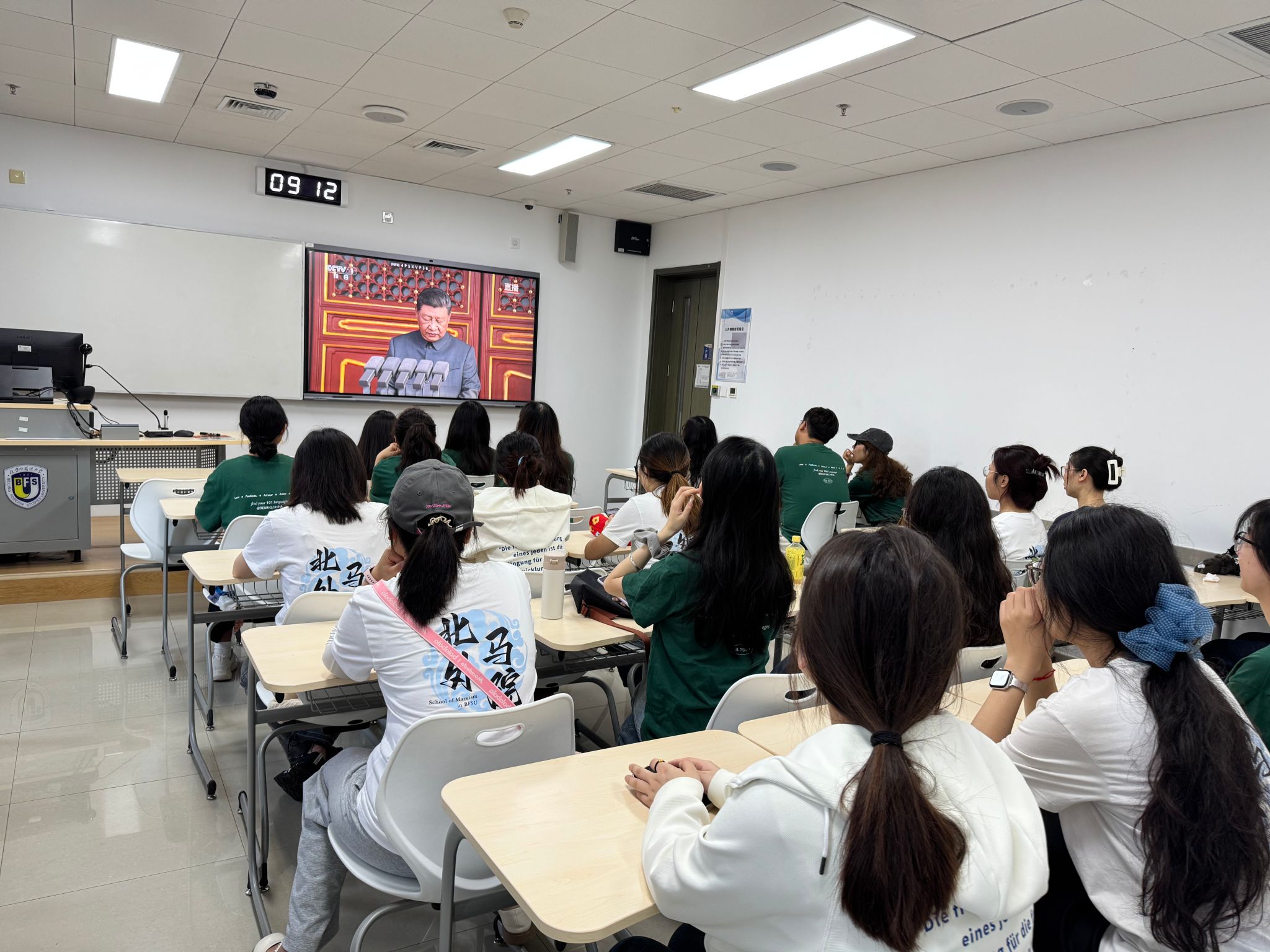 为进一步引导广大师生铭记历史、缅怀先烈,共鉴胜利荣光,凝聚奋进力量,9月3日上午,马院组织全体师生收看纪念中国人民抗日战争暨世界反法西斯战争胜利80周年大会直播,学院全体教师和学生分别在学院会议室、党员活动室、教室集中收看大会盛况。